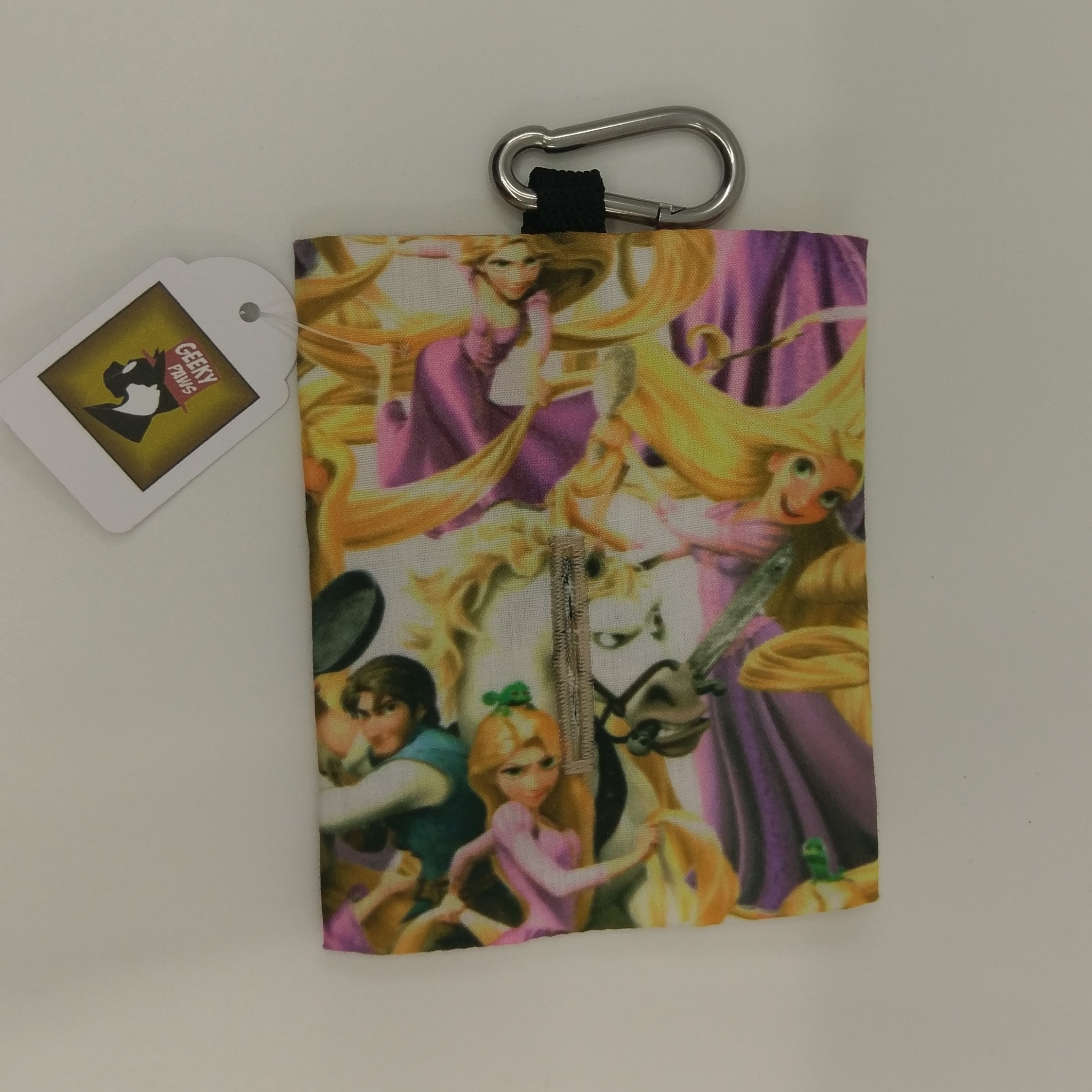 Pop a roll of plastic poo bags in the back of the dispenser, thread one through the opening at the front and clip to your geeky paws lead